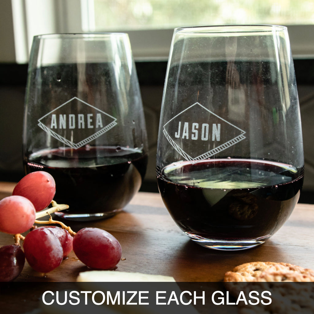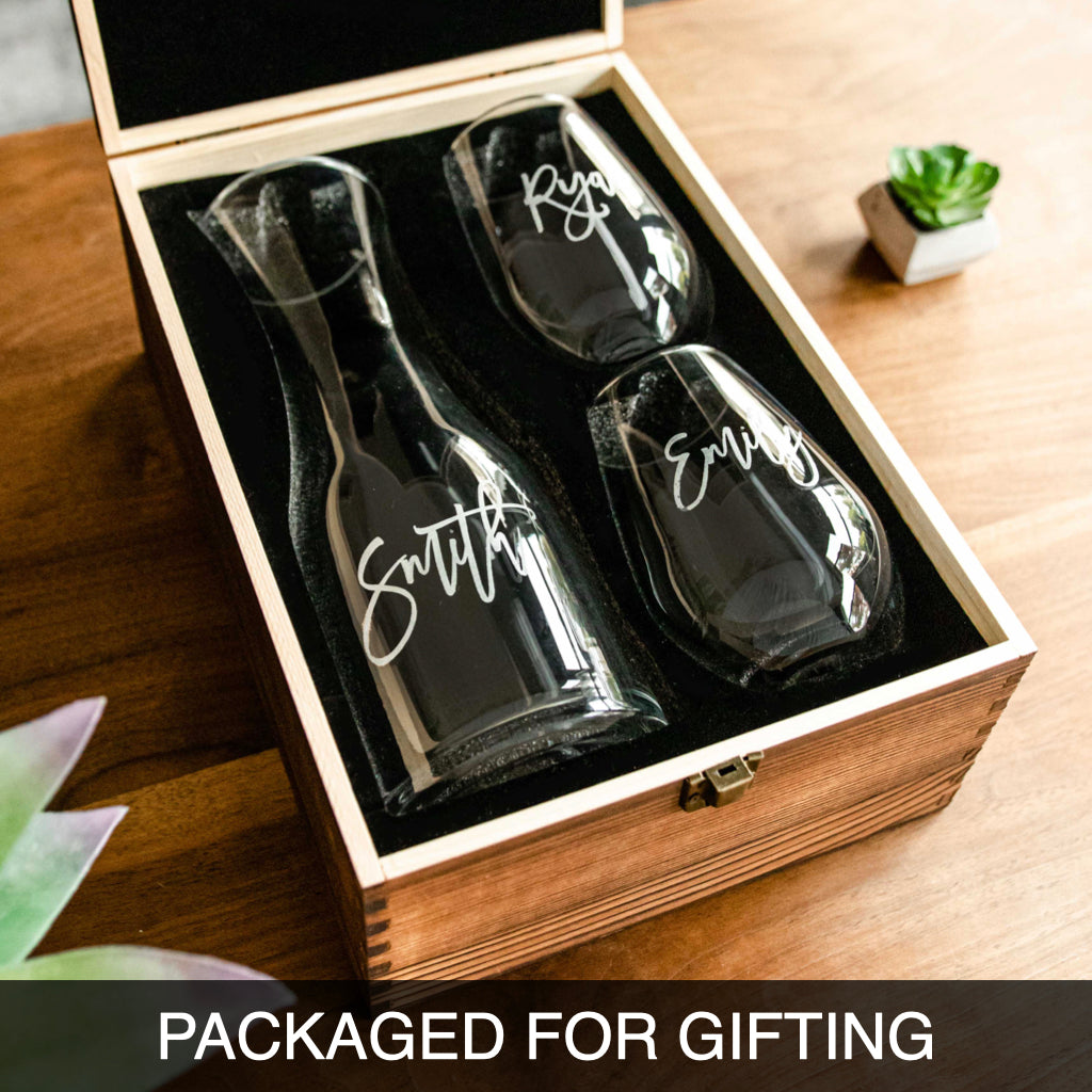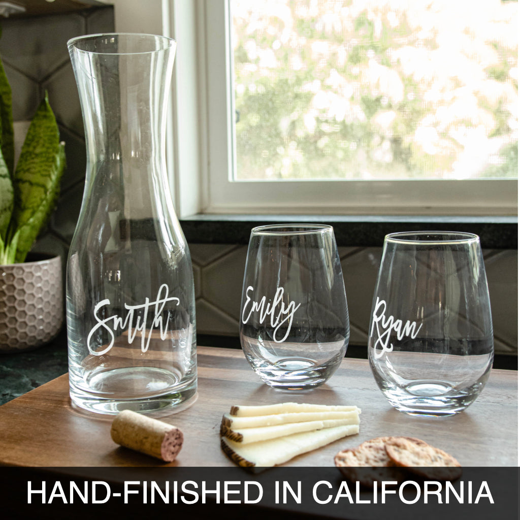 Personalized with our Script Design, they make the perfect addition to any kitchen or home bar. Embellished with the name of your choice, this set of (2) custom wine glasses & personalized Wine Decanter will be displayed with pride for years to come.