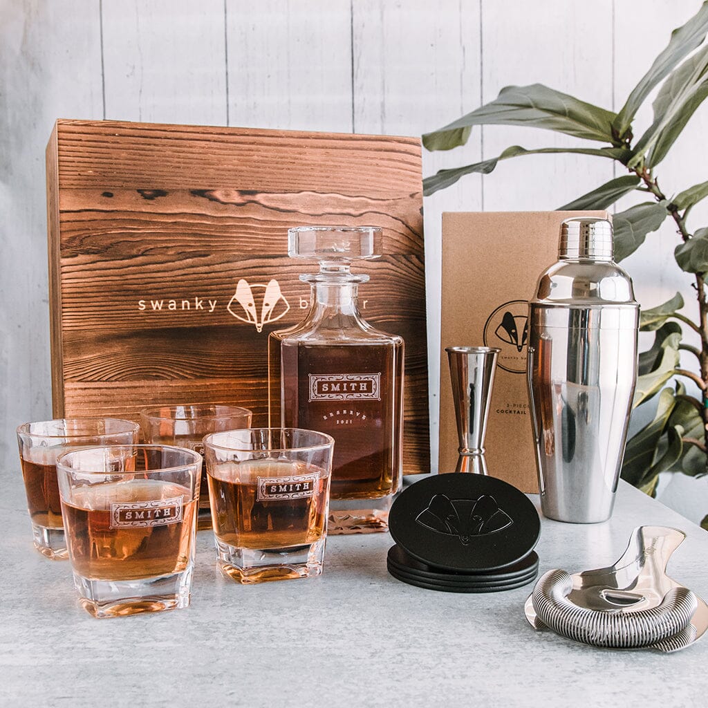 Personalize a unique gift for man in your life with Swanky Badger's customizable whiskey decanter set. Engraved by experts and made with top-quality materials. 1-day shipping options available if you're in a rush for the perfect gift!